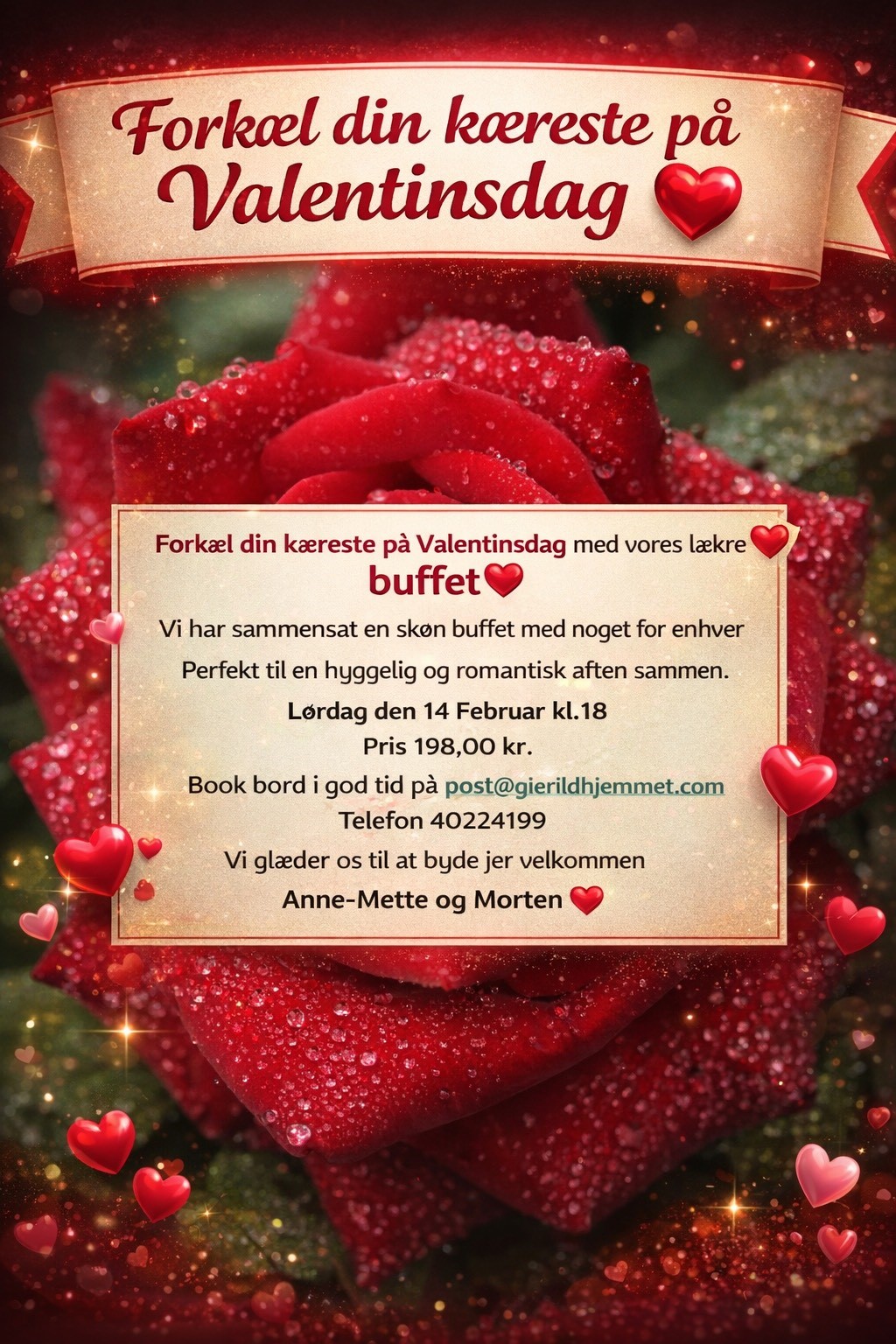 Book Bord på det hyggeligste vandrehjem til en romantisk aften med lækker mad. Vi har sammensat en lækker buffet, så i kan nyde en romantisk aften sodavand, øl og vin kan tilkøbes Vi glæder os til at byde jer velkommen Hilsen Anne-Mette og Morten